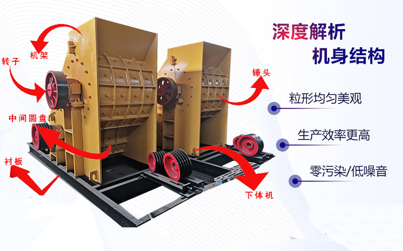 互相串連的兩套轉(zhuǎn)子,使經(jīng)上級轉(zhuǎn)子錘頭擊碎的物料立即被飛速旋轉(zhuǎn)的下級轉(zhuǎn)子的錘頭再次細(xì)碎,內(nèi)腔物料反向相互飛速碰撞,相互粉碎,達(dá)到錘粉料、料粉料的效果,直接卸出。