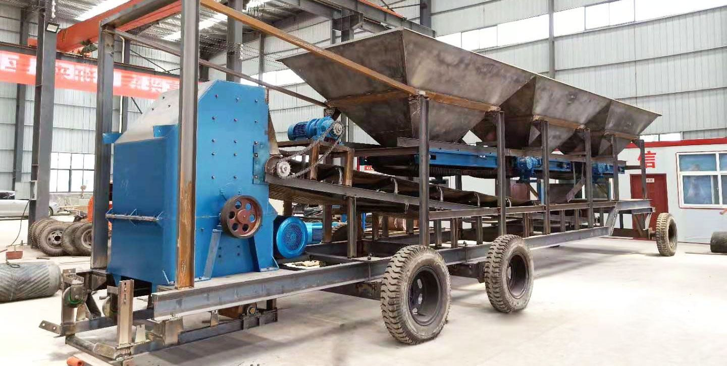 用裝載機將待破碎的物料裝入料斗,通過輸送帶的傳動,將物料送到破碎機,在掛有錘頭的轉子盤在電動機的驅動下,帶動錘頭做高速圓周運動,當物料進入破碎腔后,受到高速旋轉錘頭的打擊,物料高速射向反擊板后的撞擊、高速飛射物料間的摩擦撞擊而破碎,符合粒度要求的物料由規定篩孔中卸出。經一次破碎粒度不符合要求的物料,隨著新進物料被錘頭再次沖擊破碎。