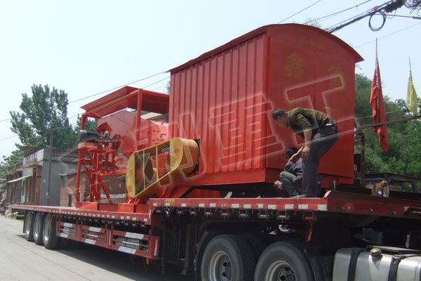 本機主要由,機架,供料倉,供料皮帶機,破碎機,輸送機,移動輪胎等六部分組成。物料經過裝載機送到供料倉,在經過供料倉下面的皮帶機傳送到破碎機里,電機經過三角帶轉動到破碎機大輪,是破碎機里的錘頭按照調整好的方向運行,利用錘頭的力量和慣性將破碎機里的物料破碎。